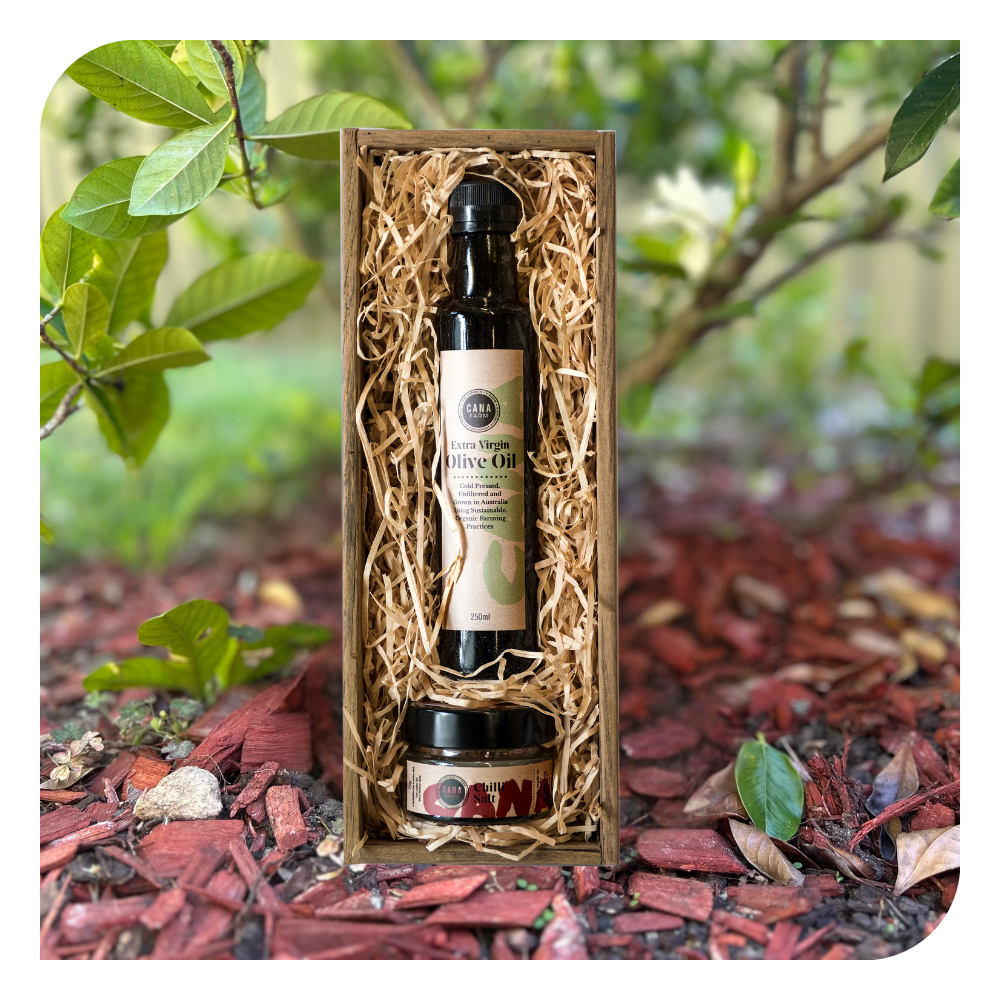 Hamper products are picked to order and presented in your preferred packaging! Choose between our traditional handmade timber boxes or Cana branded Tote Bag!